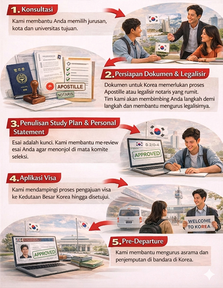 Mendaftar ke Korea membutuhkan ketelitian dokumen yang tinggi (seperti Apostille atau notaris). Di Optima, kami memberikan bimbingan personal sejak 2007 untuk memastikan dokumen Anda sesuai standar universitas dan imigrasi Korea, sehingga meminimalisir risiko penolakan.